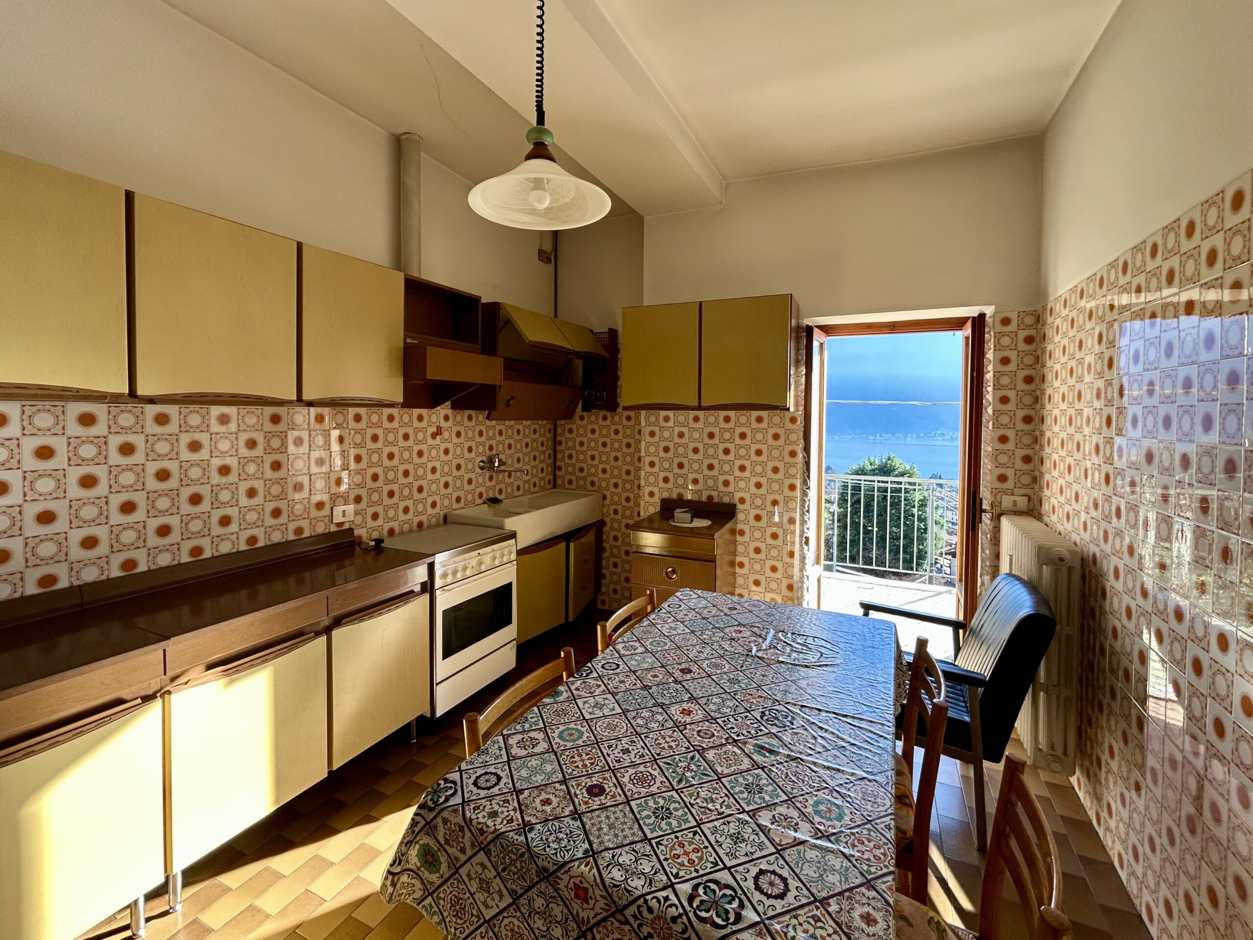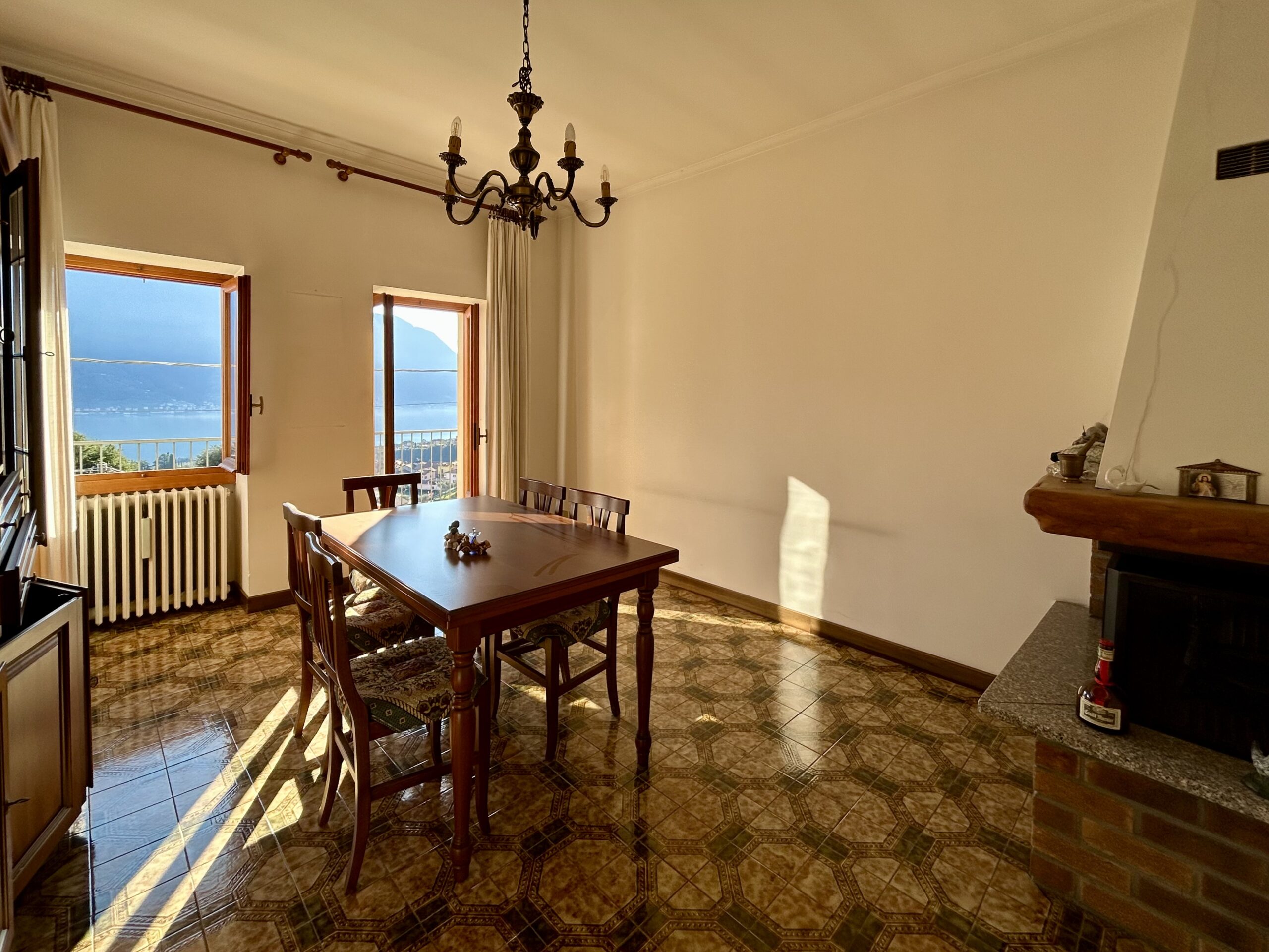 portico d’ingresso, soggiorno con camino e uscita su balcone panoramico vista lago, cucina abitabile, due camera matrimoniali, terza camera singola e secondo bagno.